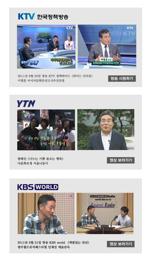 아시아문화주간을 맞아 아시아문화중심도시 조성사업의 일환으로 펼쳐지는 많은 이야기들이 방송되고 있습니다. 이병훈 단장님의 조성사업 이야기, 다문화가족들의 이야기, 인재진 예술감독님의 광주월드뮤직페스티벌 이야기 등.. 아래 링크를 통해 만나보세요~